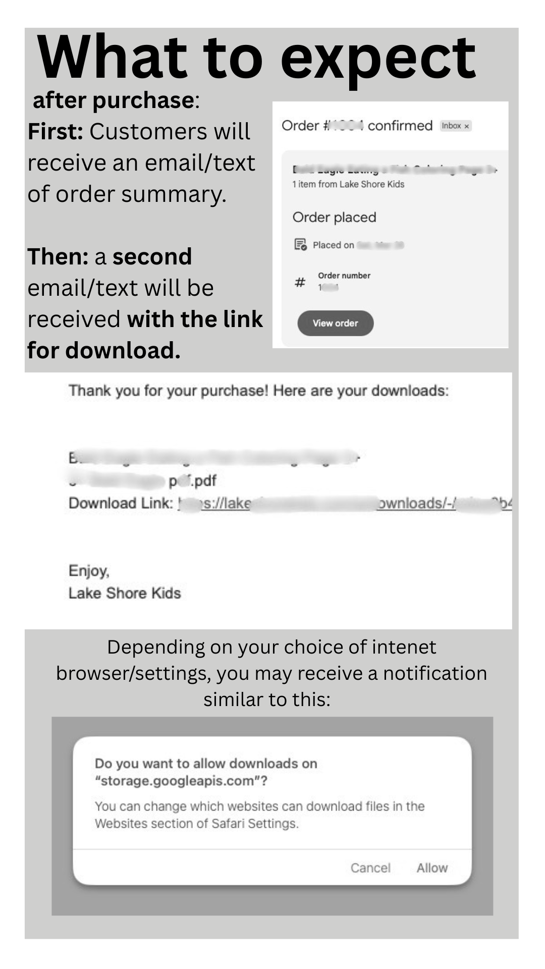 After purchase; customers will first receive a notification of their order summary. Shortly thereafter, a second email/text will be received with the link for download. If any issues occur, please contact us via email at UpLakeShoreKids@gmail.com, we will respond within 24 hours.