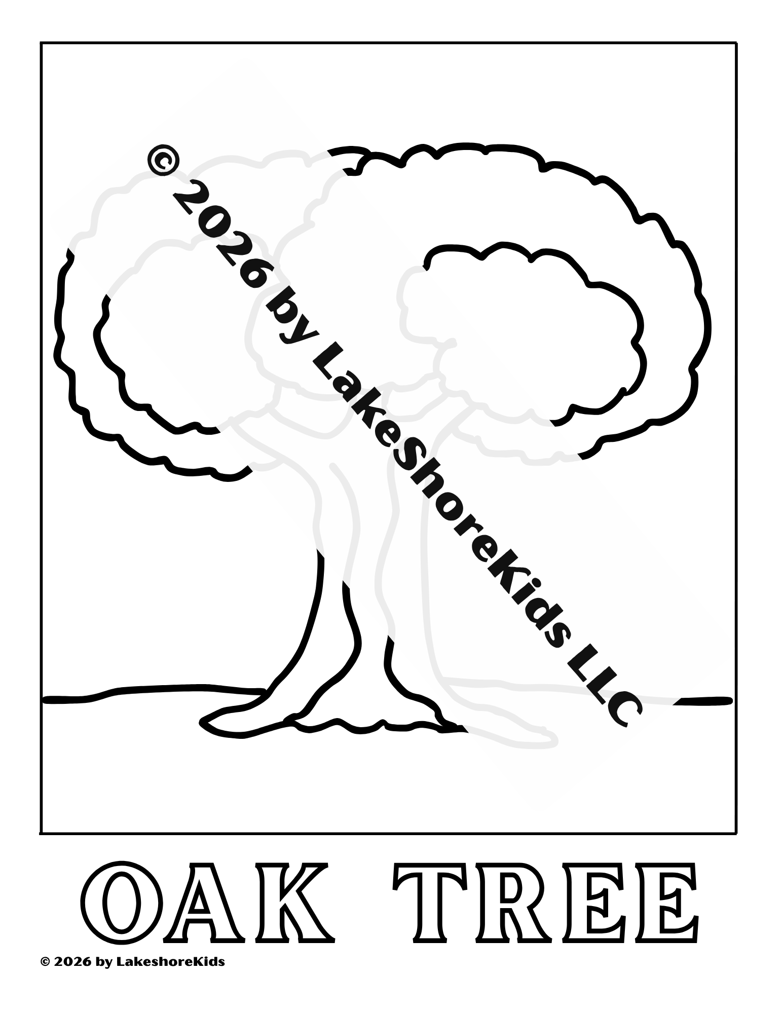 PDF Coloring page of a Big Busy Oak Tree. This is a hand drawn illustration with thick, bold lines for toddlers and children 3+ to add color at home or on the go.